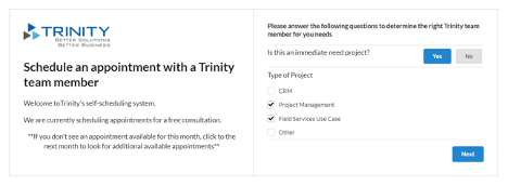 TrinityAppointment allows you to schedule meetings in an efficient manner: which means no more back-and-forth! Customers can select times with you based on your availability. Straightforward and no-nonsense so that you can focus on business. While the above is appointment-centric, clients have already enabled the same customer self-scheduling of home visits such as estimates or installation work. One customer enabled the ability for clients to self-schedule income tax support and was able to increase the efficiency of the process by ten times.