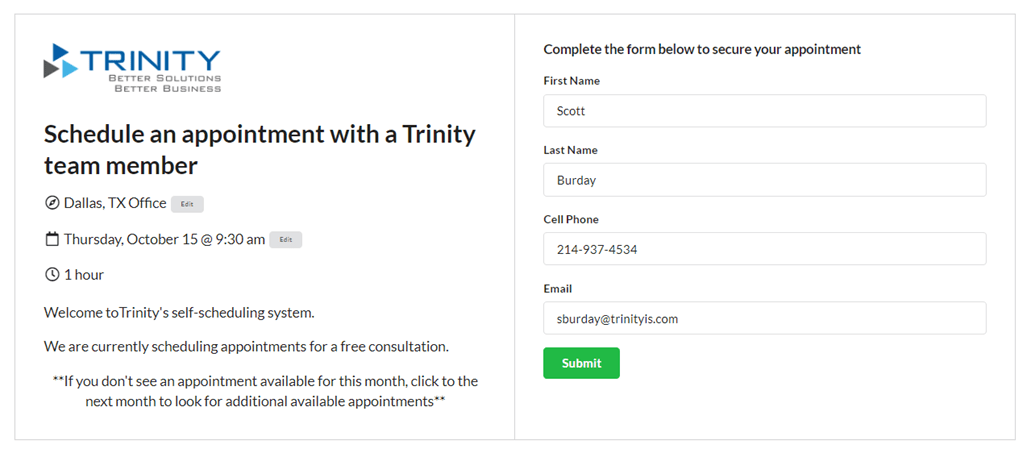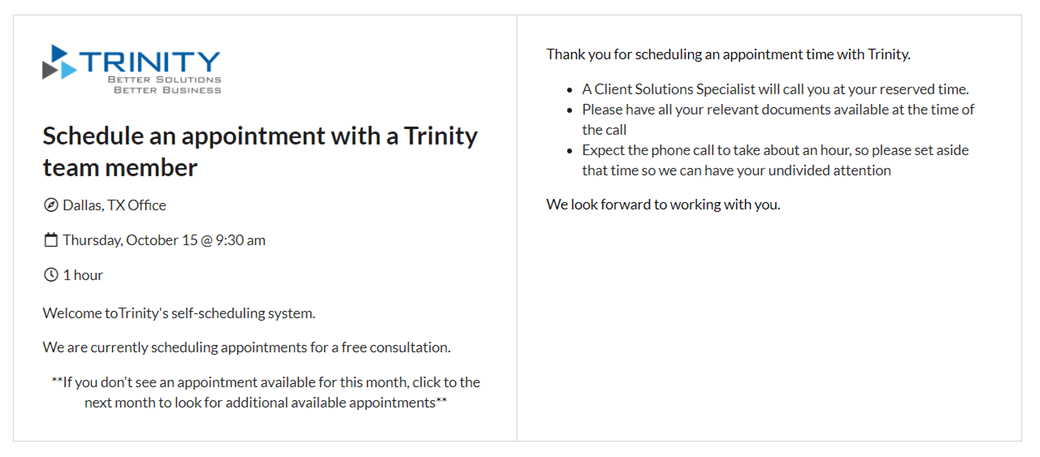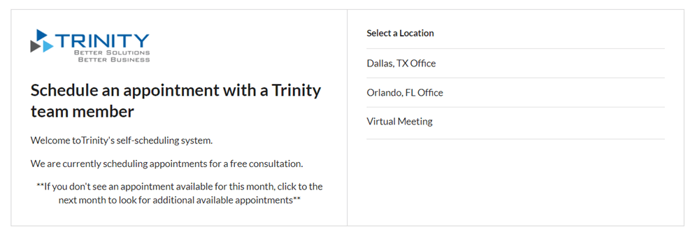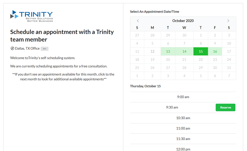 Learn more about TrinityAppointment, and feel free to inquire about how we can make the perfect appointment scheduling tool for your organization. It’s a pleasure to help clients and companies across the world boost their business with newfound efficiency!